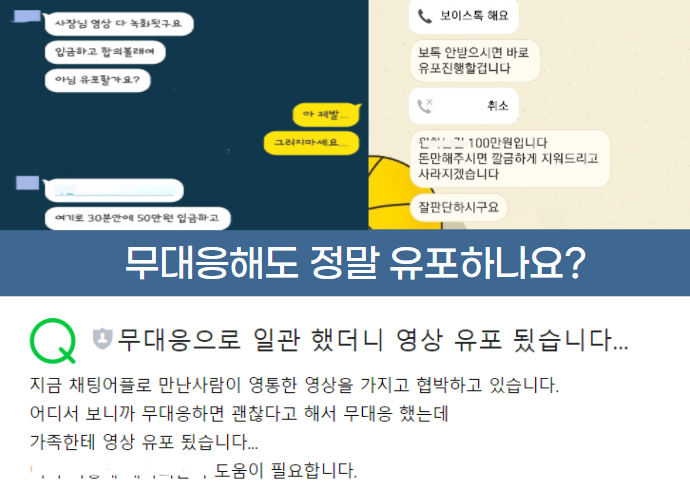 많은 분들이 가장 궁금해하시는 부분이 바로 무대응에 관련된 내용일 텐데요. 사실 가해자에게 무대응 하는 것은 확률 게임이나 마찬가지입니다. 이미 지인들의 연락처나 몸캠 영상을 확보한 상태라면 언제든지 마음만 먹으면 유포를 할 수 있습니다. 물론 먼저 피해자분들께 연락을 한 다음에 계속 무대응 하면 포기하는 경우도 있겠죠. 그래서 인터넷에 검색해보시면 무대응 해서 넘어갔다고 하시는 분들도 종종 볼 수가 있습니다.