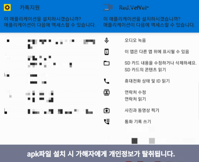 apk파일을 설치했을 때 권한 허용 설정 화면을 먼저 확인하실 수 있는데요. 생각보다 정말 많은 정보들이 가해자에게 넘어갈 수도 있습니다. 오디오 녹음뿐만 아니라 휴대전화 상태, 연락처 읽기, 사진 동영상 등등 해킹 파일로 인해 가해자들에게 수많은 데이터들이 한 번에 전송될 수 있습니다.