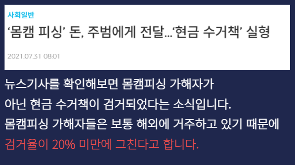 사실 몸캠피싱 사례와 같이 디지털 성범죄 피해를 당했을 때 가장 먼저 떠올리는 것은 바로 경찰에 신고하는 것입니다. 하지만 다른 범죄들과는 달리 몸캠피싱의 경우 경찰에 신고해도 검거율이 20%에 그치기 때문에 사실상 큰 도움을 받기 어려운 실정이라고 하는데요. 물론 신고하시는 것은 상관없지만, 가해자와 관련된 데이터는 확보해두시는 것이 좋습니다.