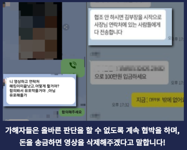 여기서 궁금한 점은 바로 가해자들이 돈을 주면 영상을 삭제해주겠다고 하는데 빨리 돈을 보내고 끝내면 안 될까요?라고 묻는 분들도 있으실 것 같지만, 가해자들은 주 목적인 금전을 갈취하는 것입니다. 오히려 돈을 송금했던 사람에게 집착하고 더 많은 금액을 요구할 확률이 높습니다. 그리고 오히려 돈을 송금하지 않은 사람들과 비교해봤을 때 돈을 송금했던 사람이 더욱 눈에 튀는 것이죠.
