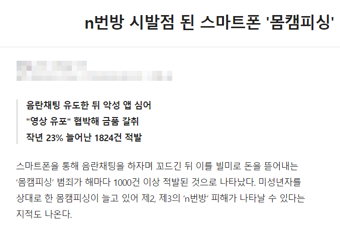 이는 다른 단어로는 몸캠사기, 몸캠피싱이라고도 불리며, 한 번 영상이 유포가 된다면 일상적인 생활을 하기 어려울 정도로 정신적인 피해가 상당할 것입니다. 하지만 정신만 차리고 빠른 조치를 취하신다면 충분히 피해 상황에서 벗어날 수 있다고 합니다.