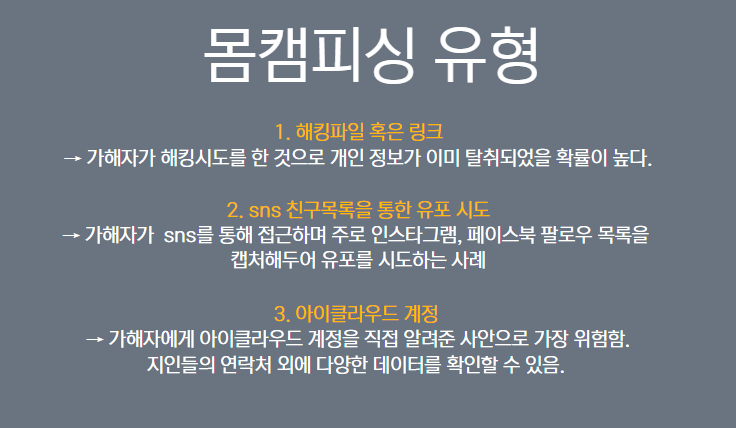 몸캠피싱은 크게 3가지 유형으로 나눠볼 수 있는데요. 해킹파일이나 링크를 통해서 개인정보가 탈취된 경우에는 지인들에게 바로 연락이 갈 수 있어 아주 위험합니다. 마음만 먹으면 언제든지 유포를 시도할 수 있기 때문에 최대한 신속하게 유포 방지 조치를 취해두셔야 피해를 줄일 수 있습니다.