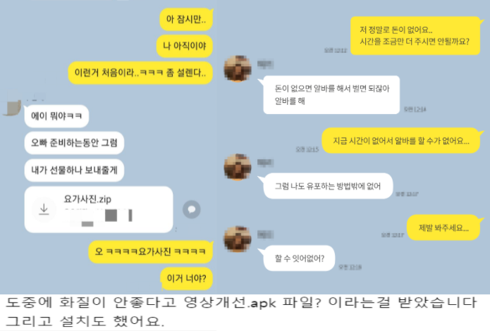이런 경우도 있습니다. 전형적인 몸캠피싱 수법으로는 개인 정보를 탈취하려고 하는데 apk 파일 혹은 zip 파일을 설치하도록 유도합니다. 해당 파일을 설치하는 순간, 가해자에게 지인들의 연락처 정보뿐만 아니라 다양한 정보들이 해킹 서버로 넘어갈 수 있습니다.