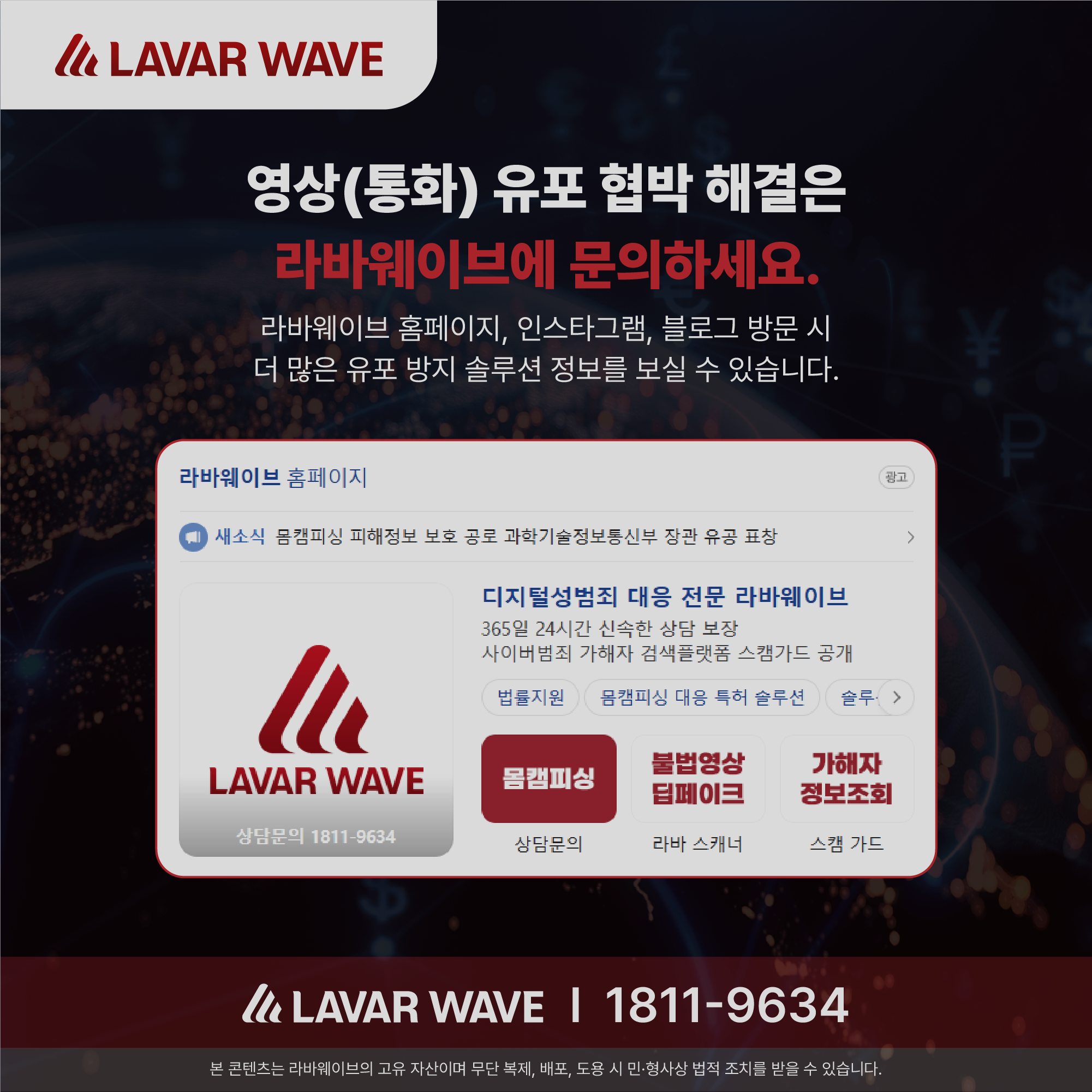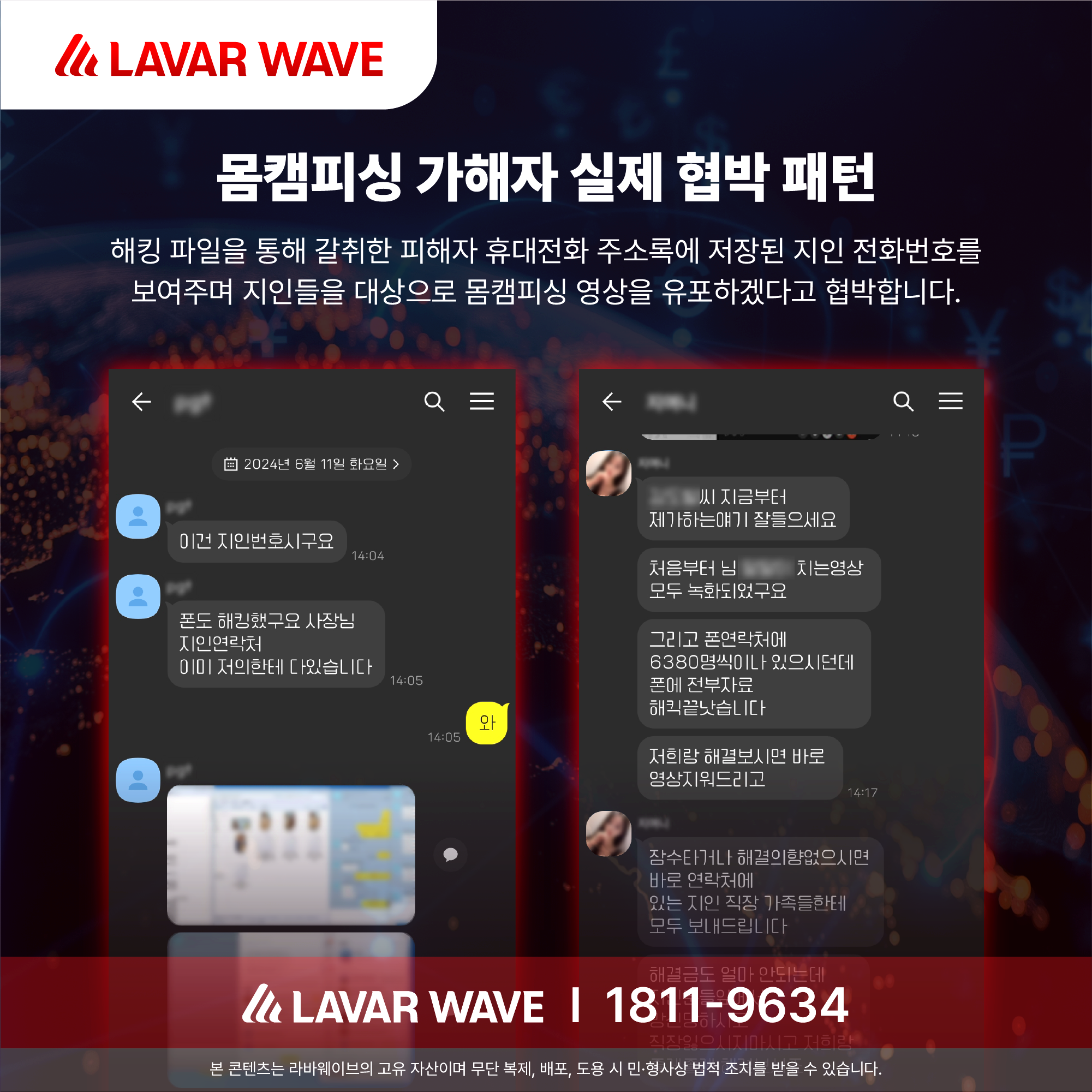 라바웨이브는 카카오톡 영상통화 사기 피해자를 위한 전문적인 기술적 해결책을 제공합니다. 범죄자가 탈취한 연락처를 기반으로 영상을 유포하려는 모든 시도를 CS 시스템이 원천적으로 차단합니다. 피싱 조직이 '전송' 버튼을 눌러도, 당신의 지인에게는 영상이 도달하지 않도록 하는 강력한 방패막이 되어 드립니다.